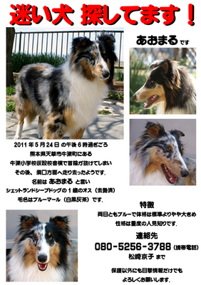 ビーズジュエラーのはむおママさんとこの愛犬、あお丸君が行方不明になったそうです・・・。